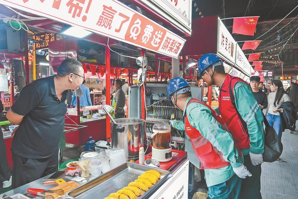 “附近商戶(hù)多,用電量大。風(fēng)機(jī)箱和變壓器是檢查重點(diǎn),測(cè)溫不能出錯(cuò)。”10月2日,山西太原供電公司青年突擊隊(duì)隊(duì)長(zhǎng)毛輕揚(yáng)在迎澤區(qū)鐘樓街開(kāi)展用電檢查時(shí),向隊(duì)員們強(qiáng)調(diào)注意事項(xiàng)。該公司團(tuán)委組織青年突擊隊(duì)聯(lián)合黨員服務(wù)隊(duì)嚴(yán)密監(jiān)控景區(qū)、商業(yè)區(qū)等人員密集區(qū)域用電情況,及時(shí)發(fā)現(xiàn)并處置用電隱患。